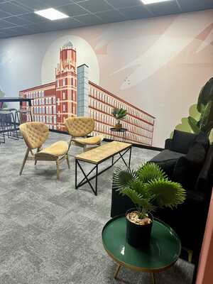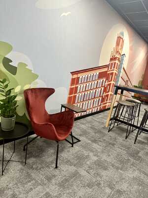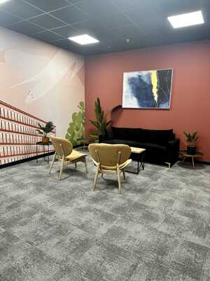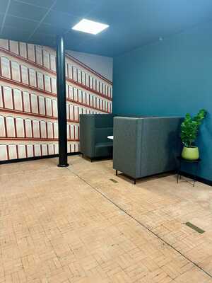 Newly refurbished communal space offering modern seating area and meeting booths.